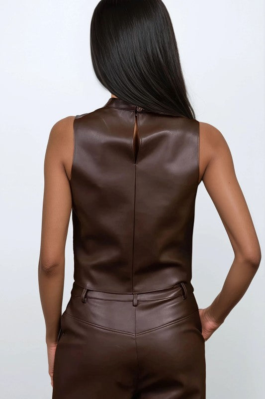 Indulge in edgy sophistication and modern style with the Christina Faux Leather Tank Top. Our chocolate brown tank top features a chic mock neck and is made with vegan butter faux leather for a contemporary look. Elevate your wardrobe with this unique and versatile piece.
