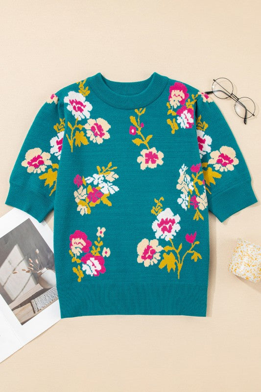 Explore the beauty of fall with our Floral Knit Top. Featuring a round neck and short sleeves, this stunning jewel tone floral knit will elevate your style. A must-have addition to any wardrobe.