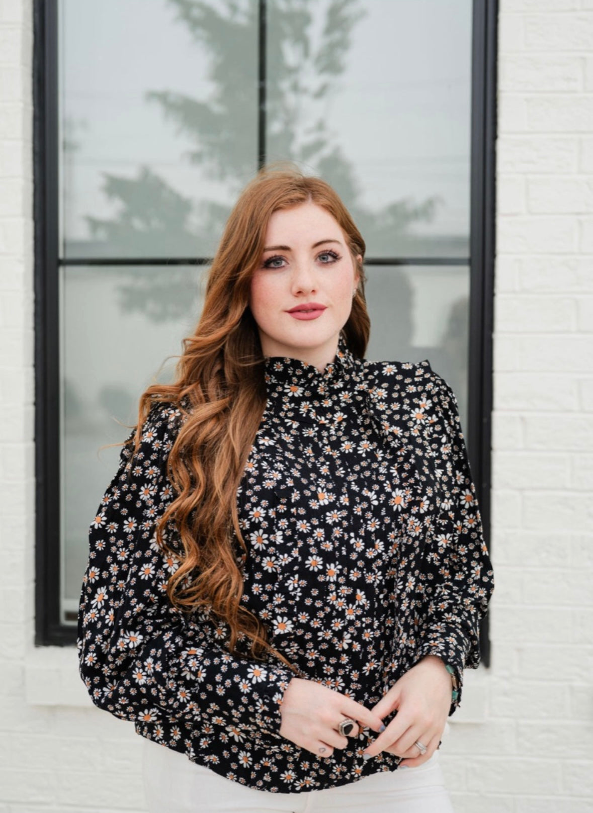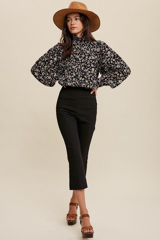 Our Flower Child Blouse features a beautiful flower print and a stylish ruffle mock neck. Additional design details include a keyhole on the back with button closure, as well as pintuck detailing on the front and back. The blouse also has long puff sleeves with a ruffle and button closure, and is finished with a clean hem.