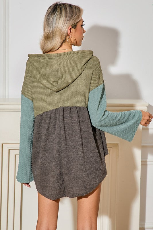 Our Helene Hoodie is a stylish and comfortable waffle knit hooded top. With its color block design, it adds a touch of flair to any outfit. Stay warm and on-trend with this must-have piece. Loose fitting, casual top.