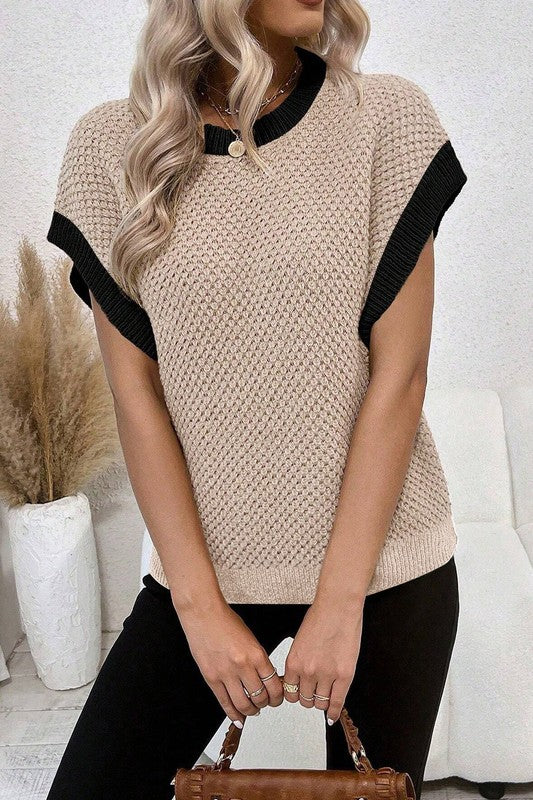 This contrast trim knitted top features a casual and relaxed fit with batwing sleeves. Its beige color with black trim provides a versatile and stylish look, making it a great layering piece for transitioning between seasons. Enjoy comfort and style with this must-have wardrobe staple.