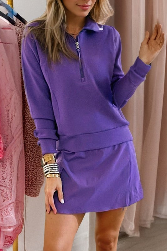 The Purple Set is the perfect choice for game day. Designed for both comfort and style, this two piece athleisure set features a zip collar and long sleeves and an elastic waist and pockets on the skort. Made from a combination of 50% polyester,45% viscose, and 5% elastane, this set provides both comfort and durability, allowing you to focus on the game.