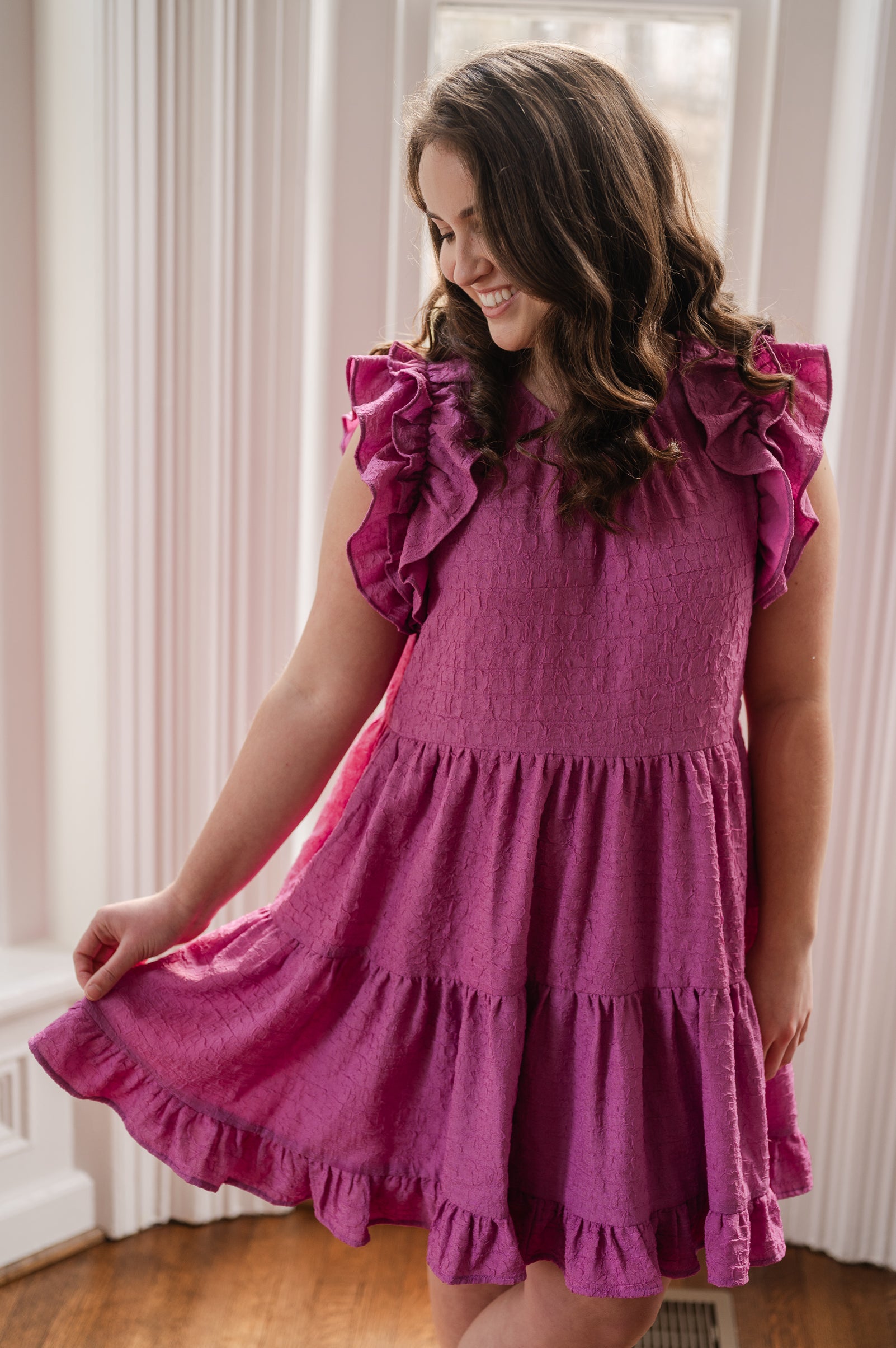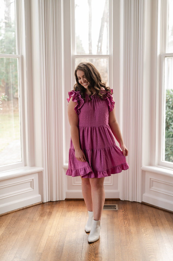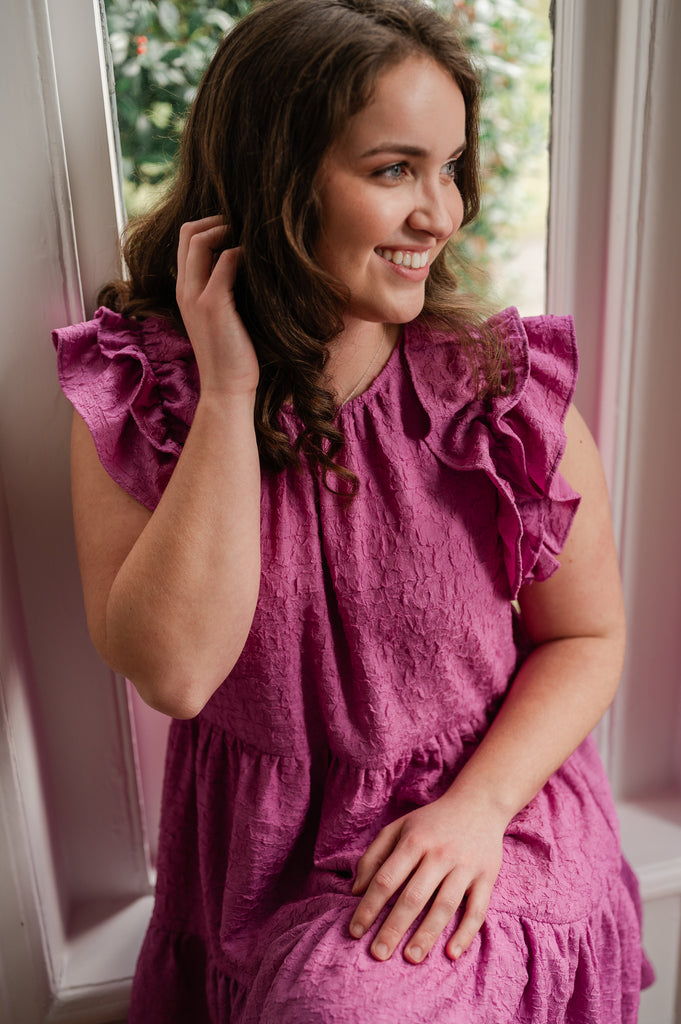 Look beautiful and stay cool in this gorgeous orchid Tessa Dress! Featuring a ruffle sleeve and hem, this lightweight and lined dress is perfect for many spring occasions such as weddings, showers, and graduations.