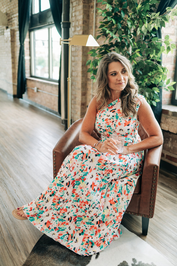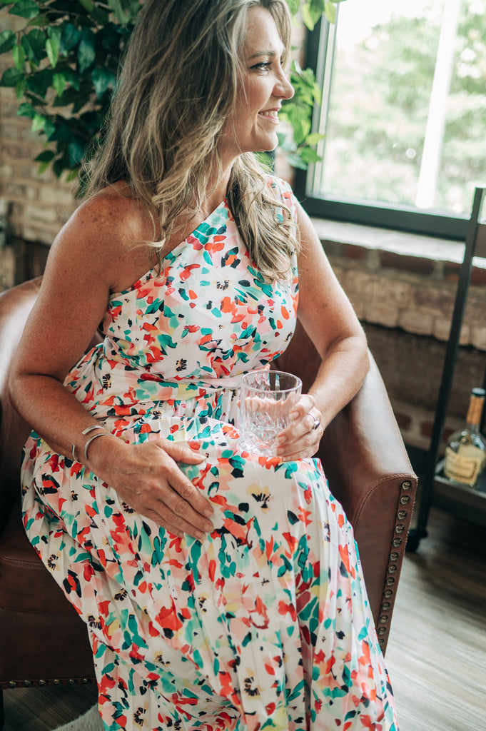 Look effortlessly chic in this Analise Maxi Dress. Crafted from lightweight woven fabric, it features an asymmetrical one shoulder neckline and shirring details at the shoulder. A twist detail at the center front waist is complemented by an elasticized back waistline and sunburst pleated skirt.